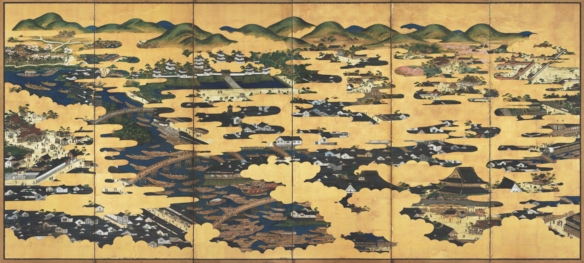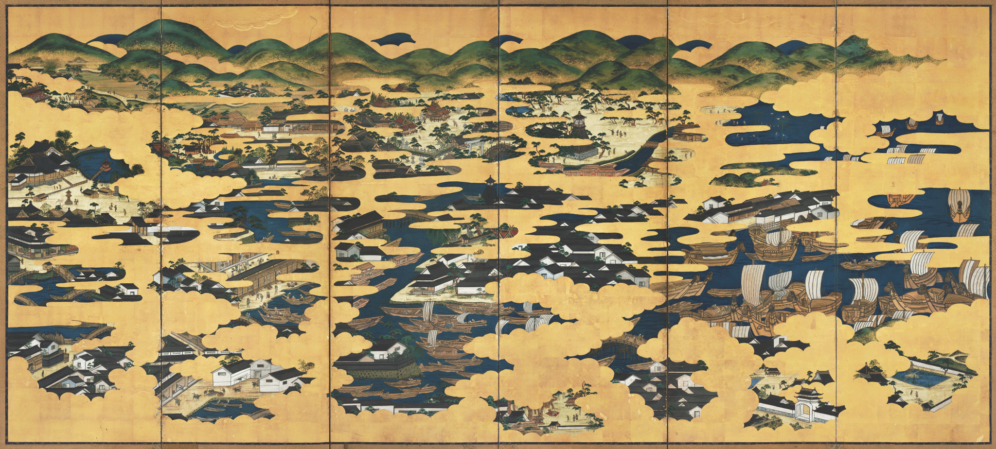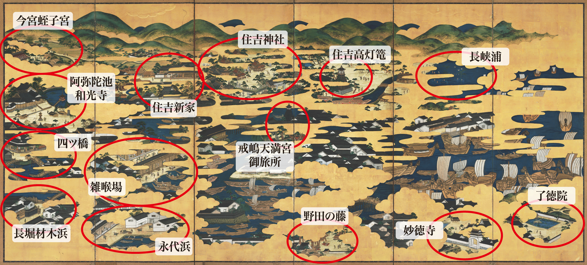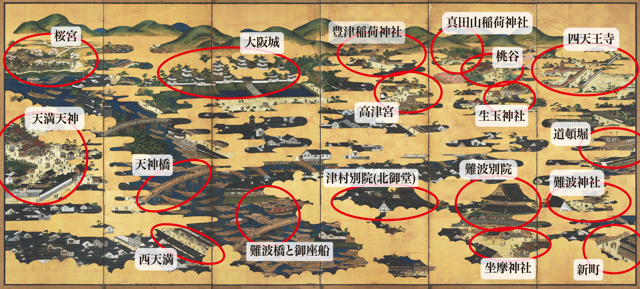 江戸後期の百以上の浪花名所をパノラマ的に描いている類例のない唯一の屏風である。